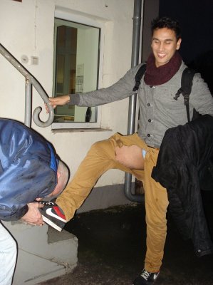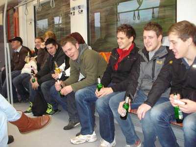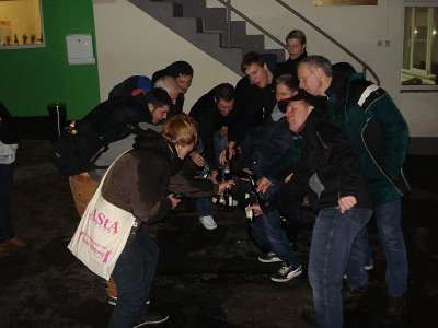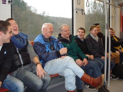 Weiter ging es dann mit der Bahn nach Löhnberg zum „Landgasthof bei Kleins“, wo wir uns lukullisch hervorragend von Bernd Holzhäuser und seinem Team verwöhnen ließen. Allerdings fielen dort „3 Experten“ negativ auf, was für ein Ärgernis sorgte….. Kurz nach dem loslaufen in Löhnberg am späten Nachmittag, setzte zeitweise starker Regen ein, was den Wanderern aber offenbar nicht allzu viel ausmachte. Am Leinpfad entlang über Ahausen ging es nach Weilburg, wo man kurz entschlossen beim Getränkeverkauf der „Brauerei Helbig“ Rast machte. FSG-Trainer Steffen Reh spendierte spontan einen Kasten Bier, der allen prima schmeckte. Sogar die Chefin Antje Helbig gesellte sich zu den lustigen FSG’lern und erfreute sich an deren toller Stimmung. Nach interessanten Bier-Fachsimpeleien ging es dann bei Dunkelheit, trotz des miserablen Wetters, weiter noch zur „Apres-Ski-Party am Lindenhof“ in Weilburg, wo der ereignisreiche FSG-Wandertag zu Ende ging. Alle freuen sich jetzt schon auf den diesjährigen Wandertag, der allerdings bei hoffentlich besserem Wetter stattfinden wird….