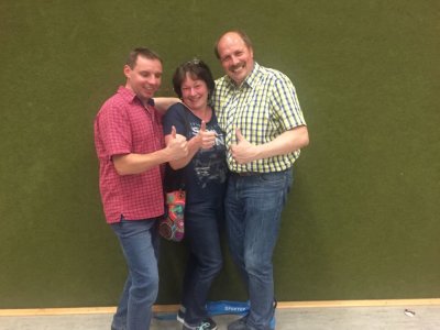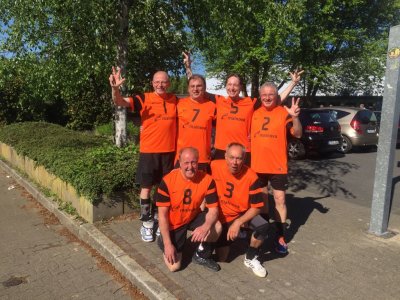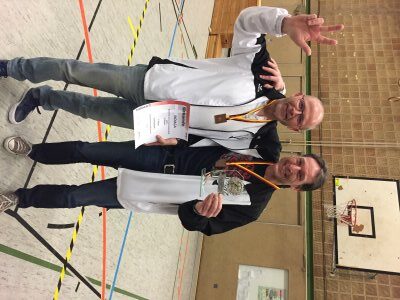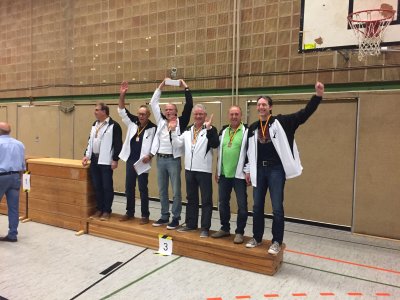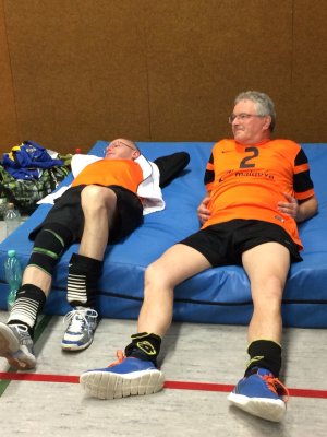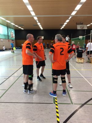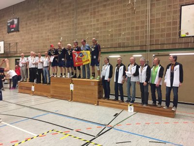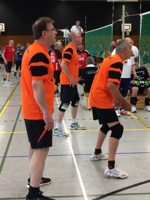 Etwas besser starteten unsere Männer 55+. Gespielt wurde in 2 Gruppen a 4 Mannschaften. Gegen Celle gaben wir den 1. Satz mit 25 : 21 ab, konnte aber den 2. Satz mit gleichem Ergebnis für uns entscheiden. Leichter taten sich die Herren gegen Eggenstein. Beide Sätze gingen relativ deutlich an uns, auch wenn der Gegner sich lange werte. Im 3. Spiel ging es gegen den Geheimfavoriten aus Rußheim . Die Badener ließen von Beginn an keine Zweifel aufkommen und besiegten uns in beiden Sätzen. Da Celle sich gegen Eggenstein einen Ausrutscher erlaubte, zogen wir als Gruppenzweiter in das Halbfinale ein und trafen hier auf den Gruppenersten der anderen Gruppe. Die Mannschaft aus Malterdingen gewann beide Sätze gegen uns und so blieb uns nur das Spiel um den 3. Platz. Hier trafen wir auf das Team aus Reichertshausen (Bayern). Es entwickelte sich ein spannendes Spiel, dass wir am Ende nach langem Kampf für uns entscheiden konnten. Am Ende war die Freude und Erleichterung in unserem Lager über diese Platzierung sehr groß, auch wenn es mit der Titelverteidigung nicht geklappt hat.