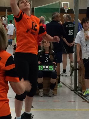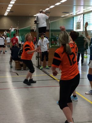 Besser lief es bei Mixed 55. Gegen Norden gelang mit 2 siegreichen Sätzen ein guter Start. Gegen die starken Wattenscheider, sie wurden am Ende Vizemeister, mussten wir nach gutem Spiel den ersten Satz abgeben (21 : 25), den 2. Satz konnten wir aber mit 25 : 19 für uns entscheiden. Im nächsten Spiel ging es gegen Ober-Olm. Wenn wir hier beide Sätze gewinnen wären wir als Gruppensieger in die Halbfinalspiele gegangen. Leider konnten wir aber nur einen Satz gewinnen und am Ende gingen wir als Gruppenzweiter in die Finalspiele. Im Halbfinale trafen wir auf Rußheim, den späteren Deutschen Meister. Der 1. Satz ging mit 25 : 21 verloren und nach spannendem Spiel mussten wir auch den 2. Satz mit 25 : 23 abgeben. Es blieb wieder nur das Spiel um den 3. Platz. Hier trafen wir auf den amtierenden Deutschen Meister aus Celle. Der 1. Satz war hart umkämpft und endete mit 28 : 26 für Celle. Auch im 2. Satz behielt Celle die Oberhand und wurde am Ende 3. der DM. Uns blieb, wie schon im Vorjahr, nur der undankbare 4. Platz.