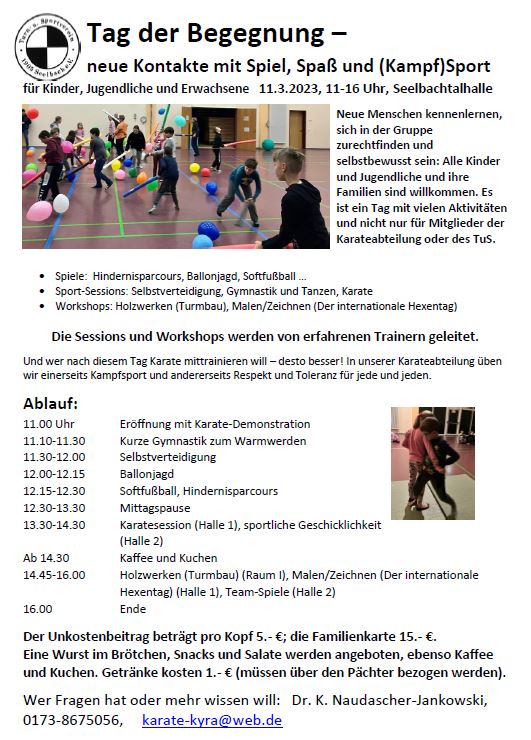 Bewegung und Begegnung liegen nicht weit auseinander – das konnten die Besucher des Tags der Begegnung in der Halle in Seelbach erleben. Die Karateabteilung des TuS Seelbach hatte Kinder, Jugendliche und Familien zu einem Tag voller Aktivitäten eingeladen. Knapp sechzig BesucherInnen lernten neue Menschen kennen oder trafen sich mit bekannten. Nach der Begrüßung durch Thomas Zanger vom Vorstand des TuS konnte sich jeder überzeugen, dass Karate ein Sport mit und in der Gruppe ist. Bei der Karatedemonstration zeigten achtzehn Kinder und Jugendliche, was sie in einem Jahr gelernt haben. Die Sechsjährigen als jüngste Mitglieder liefen die ersten Heian Katas und zeigten Wurftechniken – strikt nach Geschlechterproporz!