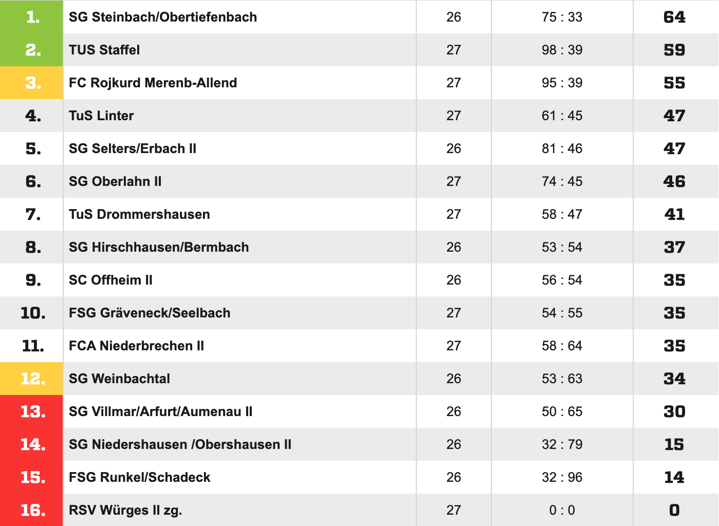 Die SG Steinbach/Obertiefenbach steht mit 64 Punkten souverän an der Spitze. Acht Siege (Sieben ohne gg. Würges) in Folge, ein beeindruckendes Torverhältnis von 75:33 – die Statistik spricht eine klare Sprache. Der Titel ist zum Greifen nah.