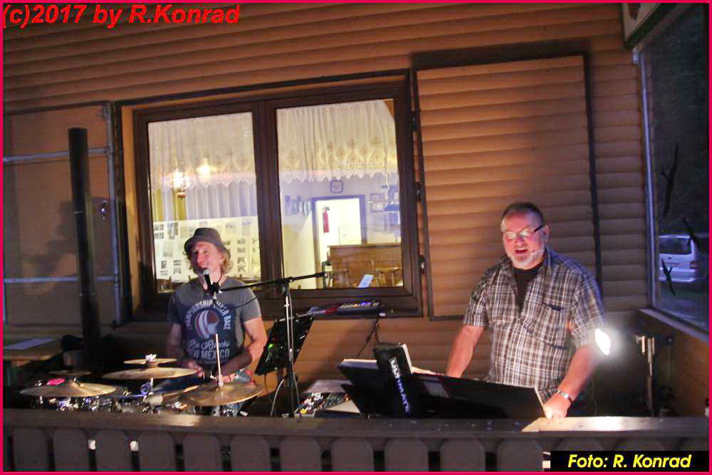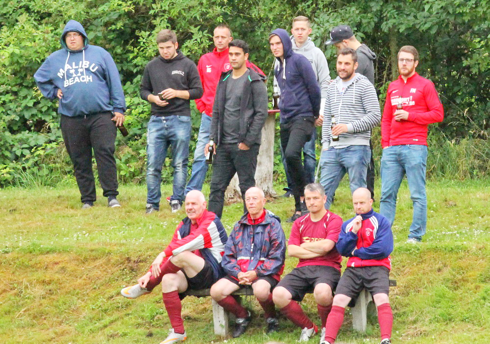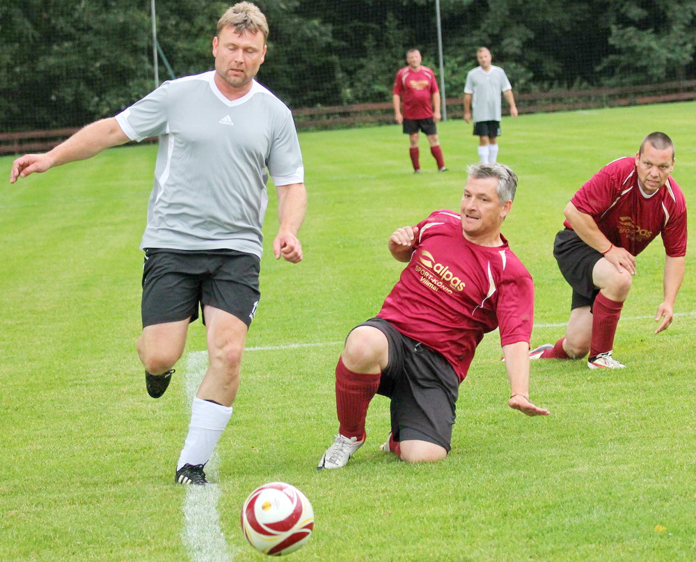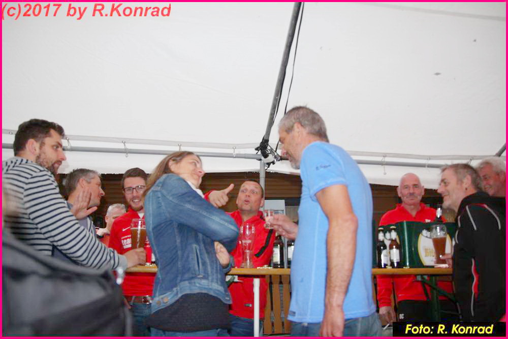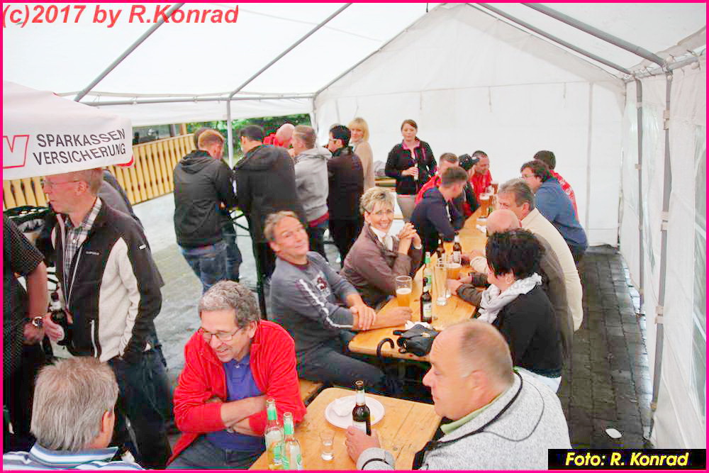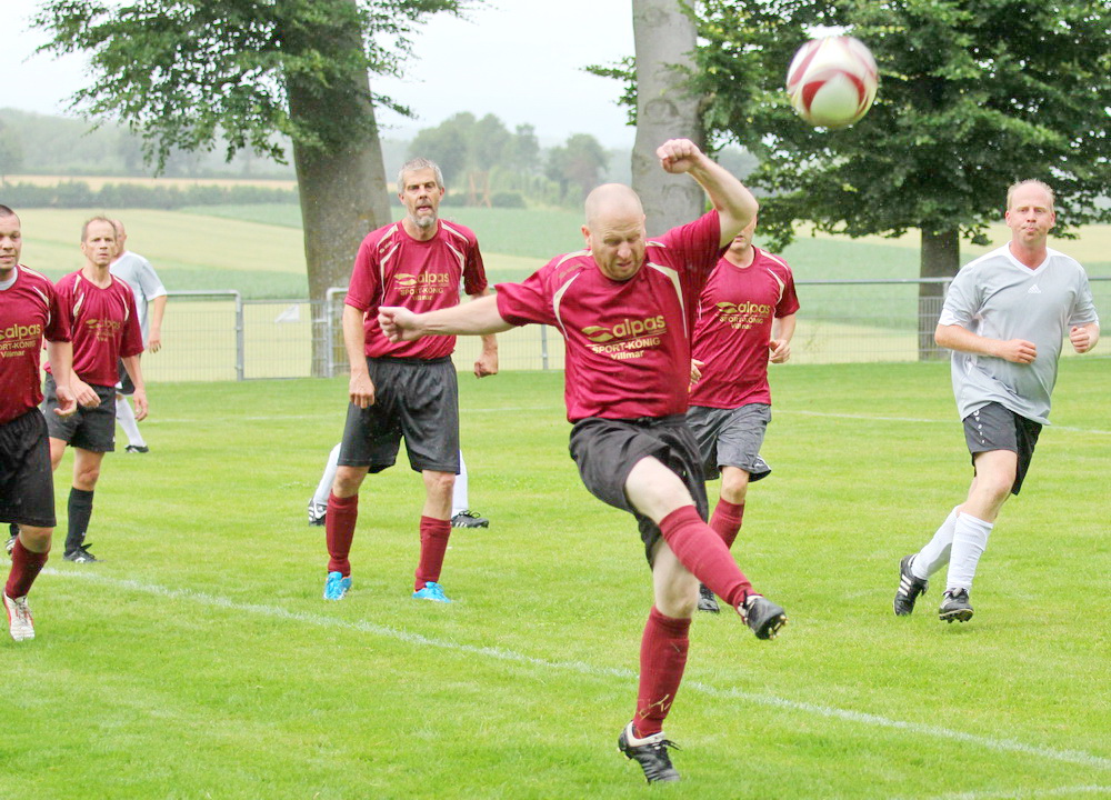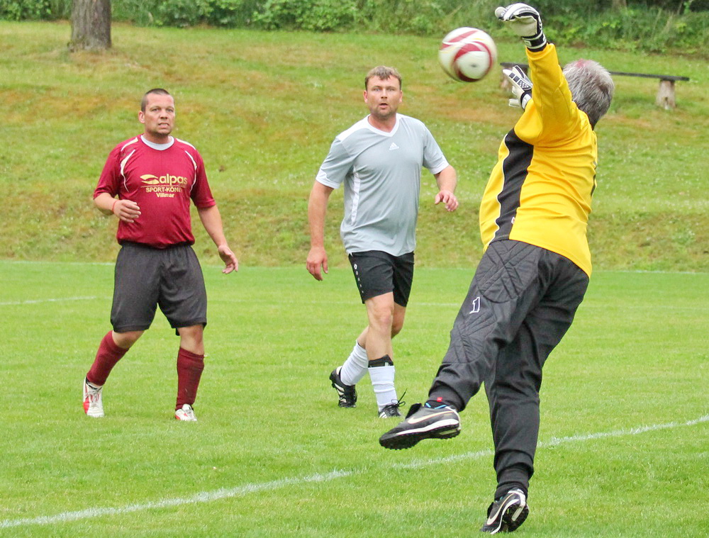 Schade, dass Petrus dem TuS zur 25. Wiederkehr des Sportheimbaues nicht ganz wohlgesonnen war… Kühl und regnerisch präsentierte sich das Wetter am 1. Juli-Wochenende, leider so wie es Vorstand Gerhard “HUGO” Weil anhand des 100-jährigen Kalenders vorhergesagt hatte… Diejenigen, die trotzdem gekommen waren, hatten aber ihre helle Freude. Eingeläutet wurde das Jubiläum am Samstag-Nachmittag mit einem Fußballspiel der alten Herren. Die SG Lahntal (AH TuS Seelbach – SV Arfurt – TuS Aumenau) traf dabei auf die Gäste des FCA Niederbrechen und musste eine herbe 0:4 Niederlage quittieren, welche aber der Stimmung keinen Abbruch tat. Die beiden Teams mit Betreuern, Spielern und Gästen versammelten sich anschließend im kurzfristig aufgestellten Zelt vor dem Sportheim und ließen sich Getränke und Würstchen munden. Dirk Graubner (Hot Stuff -Gräveneck) nahm auf der Terasse Platz und hielt die Besucher mit flotten Oldies in Stimmung. Trotz des ungemütlichen Wetters ein toller Auftakt…